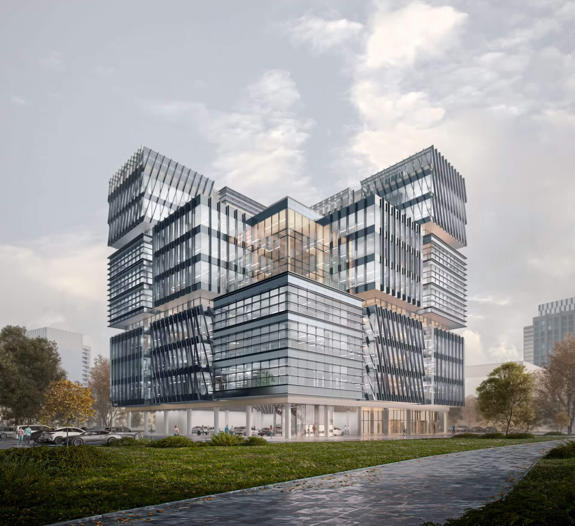 Архитектура бизнес-центра «Магистральная 12» отражает современный взгляд на деловое пространство. Монообъёмное здание объединяет 23 кубических блока, формируя выразительный силуэт и уникальный облик, узнаваемый в городской среде. Геометричная композиция фасадов, панорамное остекление и террасы создают ощущение динамики и открытости, а светопрозрачный атриум становится центром притяжения и естественного света.