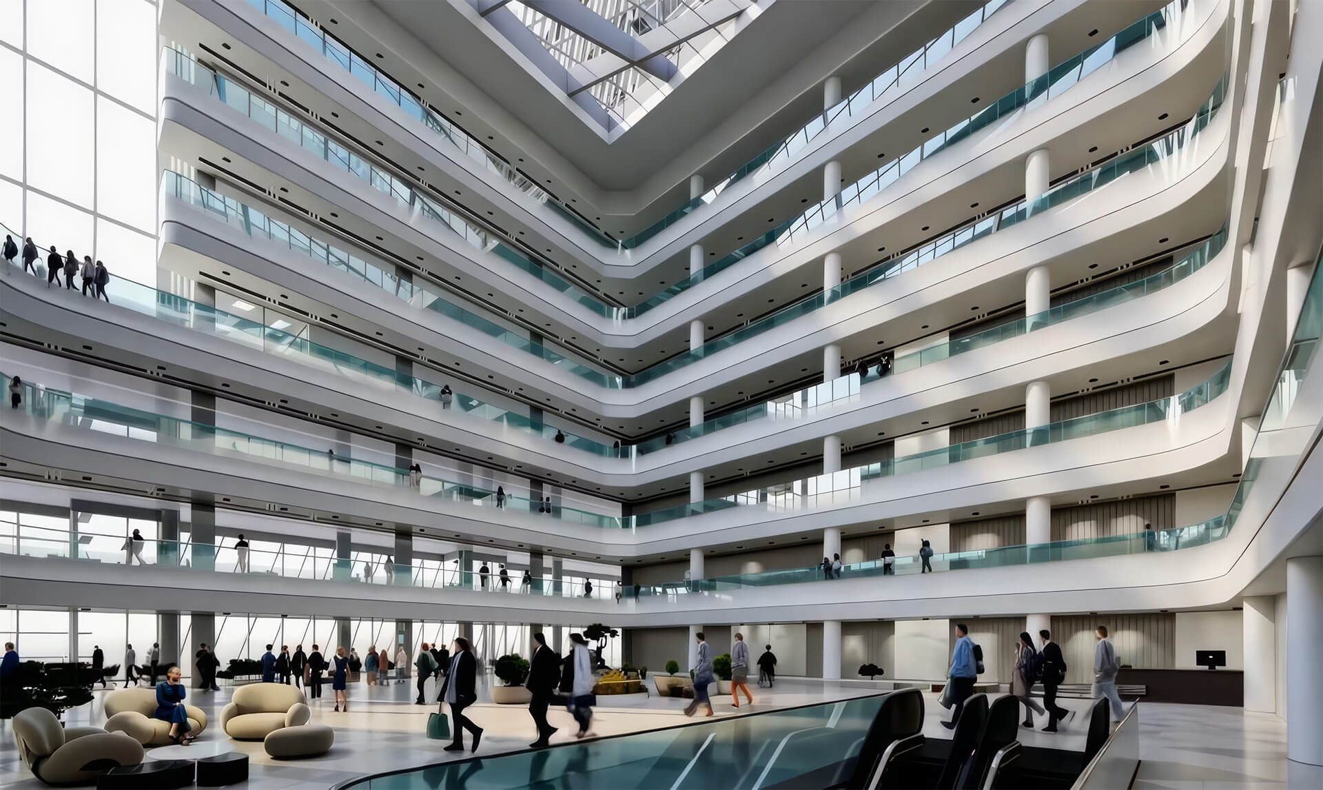 Высота первого этажа — 6,75 м, что позволяет создать эффектный входной холл с зоной ожидания и местами для встреч. В проекте предусмотрены террасы на 5 и 9 этажах, а также балконы с панорамными видами на Москву. Благодаря грамотному архитектурному решению офисные пространства получают максимум дневного света и визуально расширяются.